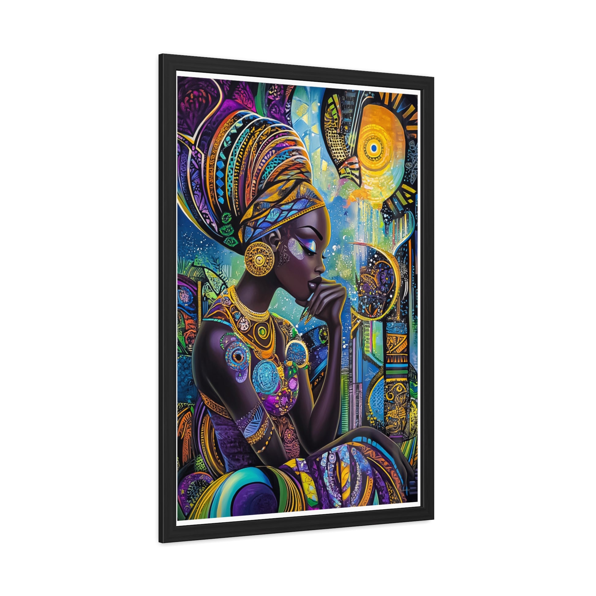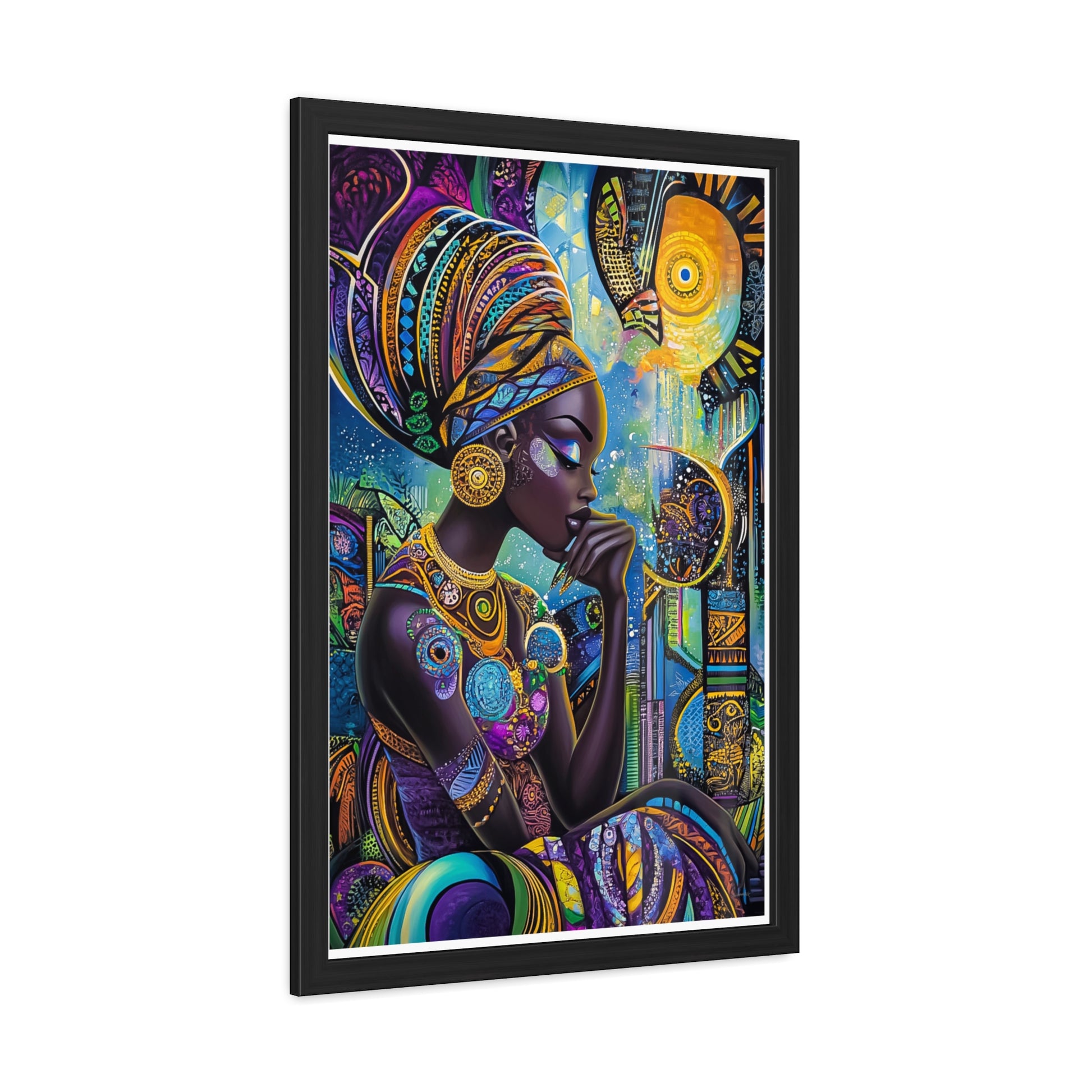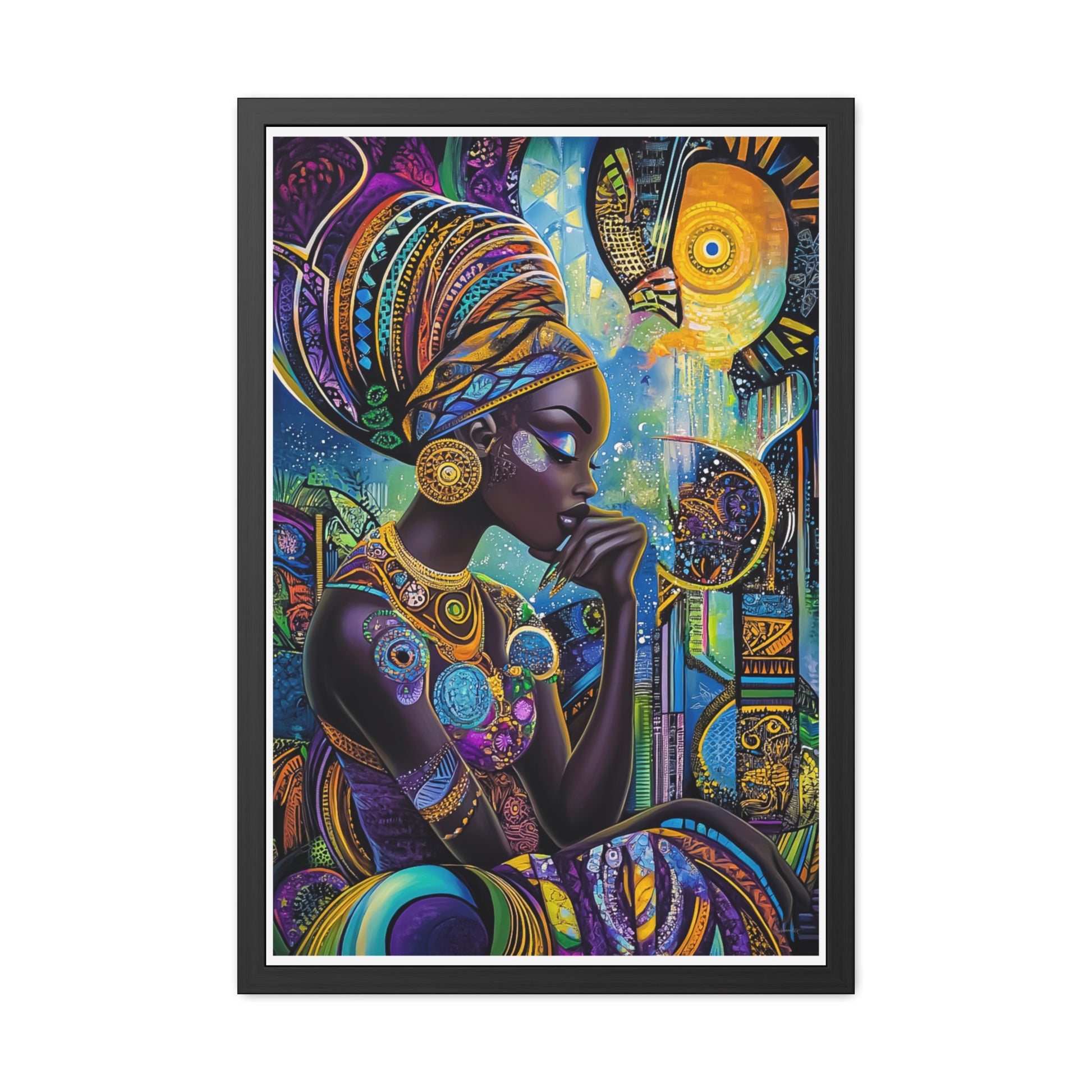 Step into a world where the cosmos bows to love’s magnetic pull. Celestia & the Devoted is a radiant homage to divine intimacy and sacred connection, steeped in the transformative essence of Aphrochrysalis. With a kaleidoscope of purples, golds, and electric blues swirling across its surface, this piece captures the breathless moment before two kindred souls collide—poised beneath glowing crescent moons and galaxies in bloom. Their adorned faces echo with ancestral wisdom and tribal grace, telling a story that transcends time—of past lives, future dreams, and the eternal now. Every vibrant stroke is a vibration of unity, a visual hymn of devotion, passion, and transformation. This Framed Poster Print is more than wall art—it’s an energetic statement piece. A cosmic centerpiece for any space yearning for depth, beauty, and intentional storytelling.
